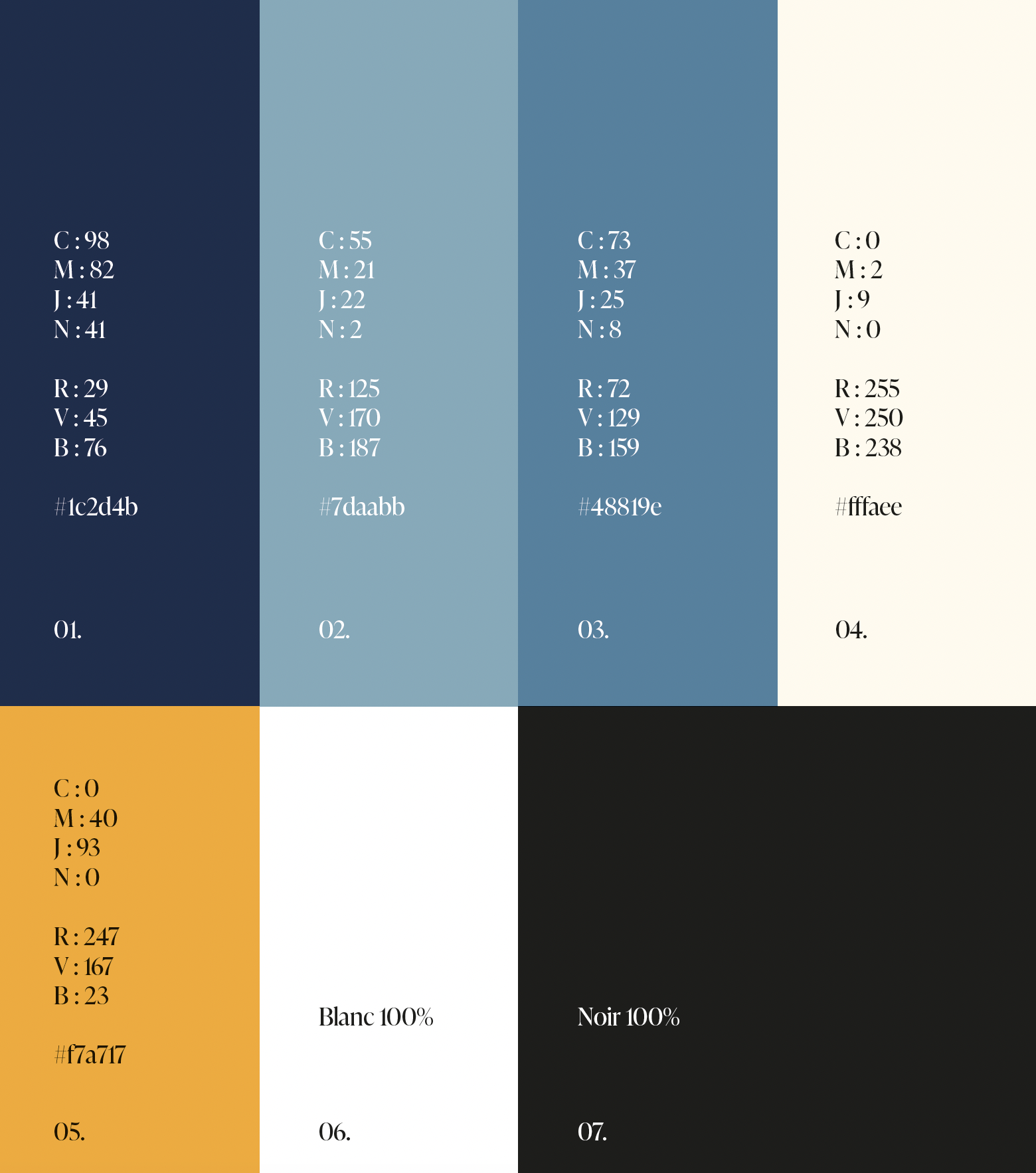 Les couleurs principales de la marque et du logo sont le bleu marine (01), le bleu clair (02), le bleu roi (03) et le beige. Le jaune orangé (5) pourra être utilisé avec parcimonie en soutien des autres couleurs.