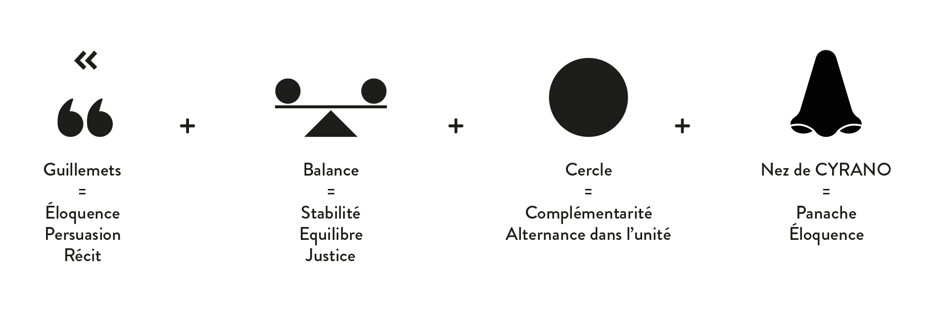 Enfin, le concept de dualité (du personnage de Cyrano – héros ambigu à la fois flamboyant et disgracieux – mais aussi du Cabinet alliant sérieux et panache) est traduit par la dualité des couleurs et celle du O final : cercle binaire représentant la complémentarité et l’alternance dans l’unité.