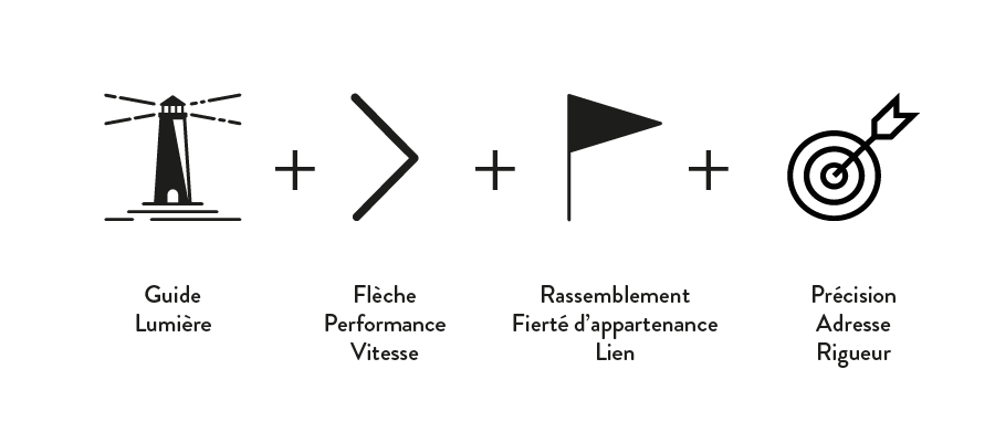 Les rayons forment des triangles qui évoquent la performance et qui se dirigent vers un même centre pour symboliser l’objectif commun, l’unité ainsi que la précision et la rigueur.